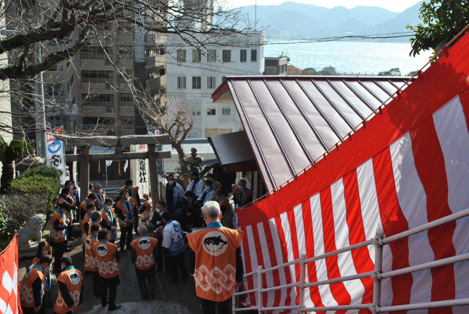 明け方の南風泊市場の視察をおえて午前10時から恵比寿神社にて開催される下関恒例の2月9日に行われる(ふく祈願祭)を見学させていただきました。下関のふぐに携わる方達が一丸に思いを込めて祈願をする行事でとても感銘をうけました。式典最後に特別!!!!下関ふく連盟 郷田理事長と相馬市福とら推進協議会とでパシャリ!!! 出張3に続く